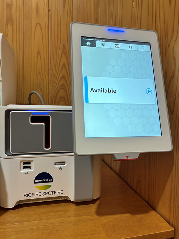 BioFire® SpotFire®システム(同時多項目PCR検査機器) 核酸の抽出、精製、増幅、検出及び結果報告までを全自動で行う装置です。 約15分で15の病原体の結果を同時に検出することができます。